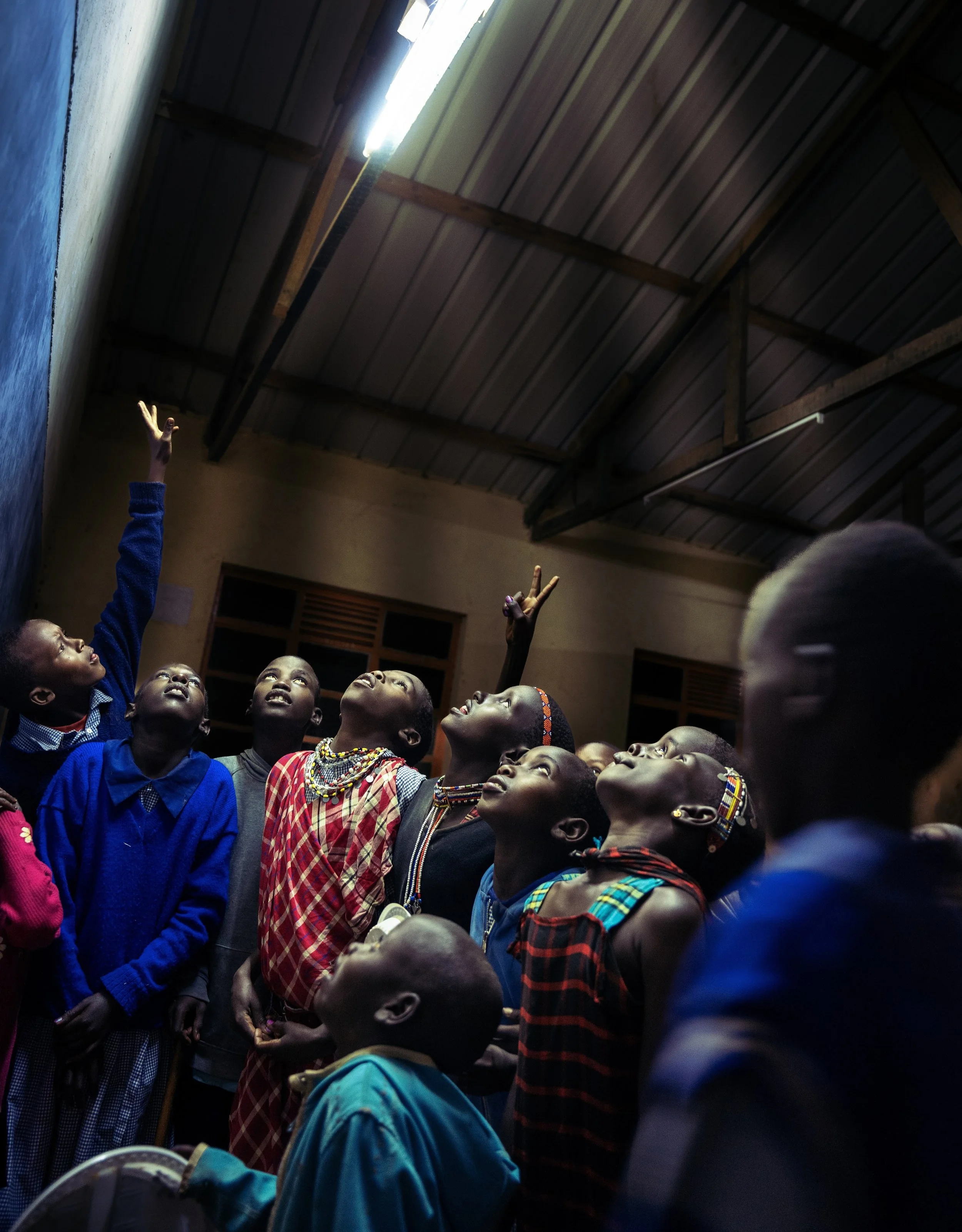 Children at Oloibor Soit Primary School in Kajiado County, Kenya experience electricity in their classroom for the first time, opening the door to modern learning tools and extended study hours for both students and adults.